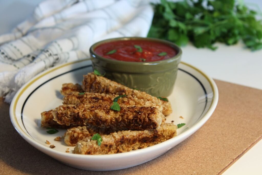 ハルーミを、調味したオートミール粉、溶き卵、オートミールの順につける。